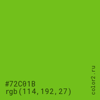 Цвет #72C01B в цветовой модели RGB обозначается тремя октетами (114, 192, 27) в десятичном формате и #72C01B в шестнадцатиричном (hex) формате, которые являются интенсивностью красного 114 (hex 72), интенсивность зелёного 192 (hex C0) и интенсивность синего 27 (hex 1B).