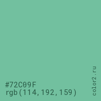 Цвет #72C09F в цветовой модели RGB обозначается тремя октетами (114, 192, 159) в десятичном формате и #72C09F в шестнадцатиричном (hex) формате, которые являются интенсивностью красного 114 (hex 72), интенсивность зелёного 192 (hex C0) и интенсивность синего 159 (hex 9F).
