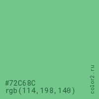 Цвет #72C68C в цветовой модели RGB обозначается тремя октетами (114, 198, 140) в десятичном формате и #72C68C в шестнадцатиричном (hex) формате, которые являются интенсивностью красного 114 (hex 72), интенсивность зелёного 198 (hex C6) и интенсивность синего 140 (hex 8C).