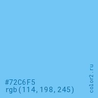 Цвет #72C6F5 в цветовой модели RGB обозначается тремя октетами (114, 198, 245) в десятичном формате и #72C6F5 в шестнадцатиричном (hex) формате, которые являются интенсивностью красного 114 (hex 72), интенсивность зелёного 198 (hex C6) и интенсивность синего 245 (hex F5).