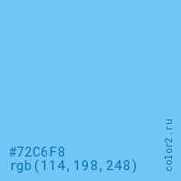 Цвет #72C6F8 в цветовой модели RGB обозначается тремя октетами (114, 198, 248) в десятичном формате и #72C6F8 в шестнадцатиричном (hex) формате, которые являются интенсивностью красного 114 (hex 72), интенсивность зелёного 198 (hex C6) и интенсивность синего 248 (hex F8).