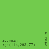 Цвет #72CB4D в цветовой модели RGB обозначается тремя октетами (114, 203, 77) в десятичном формате и #72CB4D в шестнадцатиричном (hex) формате, которые являются интенсивностью красного 114 (hex 72), интенсивность зелёного 203 (hex CB) и интенсивность синего 77 (hex 4D).