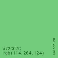 Цвет #72CC7C в цветовой модели RGB обозначается тремя октетами (114, 204, 124) в десятичном формате и #72CC7C в шестнадцатиричном (hex) формате, которые являются интенсивностью красного 114 (hex 72), интенсивность зелёного 204 (hex CC) и интенсивность синего 124 (hex 7C).