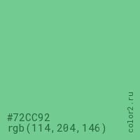 Цвет #72CC92 в цветовой модели RGB обозначается тремя октетами (114, 204, 146) в десятичном формате и #72CC92 в шестнадцатиричном (hex) формате, которые являются интенсивностью красного 114 (hex 72), интенсивность зелёного 204 (hex CC) и интенсивность синего 146 (hex 92).