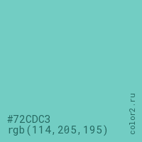 Цвет #72CDC3 в цветовой модели RGB обозначается тремя октетами (114, 205, 195) в десятичном формате и #72CDC3 в шестнадцатиричном (hex) формате, которые являются интенсивностью красного 114 (hex 72), интенсивность зелёного 205 (hex CD) и интенсивность синего 195 (hex C3).