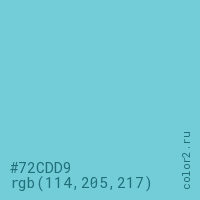 Цвет #72CDD9 в цветовой модели RGB обозначается тремя октетами (114, 205, 217) в десятичном формате и #72CDD9 в шестнадцатиричном (hex) формате, которые являются интенсивностью красного 114 (hex 72), интенсивность зелёного 205 (hex CD) и интенсивность синего 217 (hex D9).