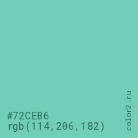 Цвет #72CEB6 в цветовой модели RGB обозначается тремя октетами (114, 206, 182) в десятичном формате и #72CEB6 в шестнадцатиричном (hex) формате, которые являются интенсивностью красного 114 (hex 72), интенсивность зелёного 206 (hex CE) и интенсивность синего 182 (hex B6).