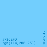 Цвет #72CEFD в цветовой модели RGB обозначается тремя октетами (114, 206, 253) в десятичном формате и #72CEFD в шестнадцатиричном (hex) формате, которые являются интенсивностью красного 114 (hex 72), интенсивность зелёного 206 (hex CE) и интенсивность синего 253 (hex FD).