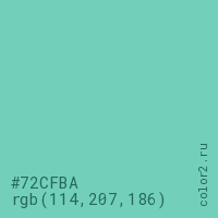 Цвет RGB(114, 207, 186) в процентом отношении количества цвета состоит из 44.7% красного (red), 81.2% зелёного (green) и 72.9% синего (blue).