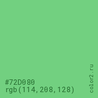 Цвет #72D080 в цветовой модели RGB обозначается тремя октетами (114, 208, 128) в десятичном формате и #72D080 в шестнадцатиричном (hex) формате, которые являются интенсивностью красного 114 (hex 72), интенсивность зелёного 208 (hex D0) и интенсивность синего 128 (hex 80).