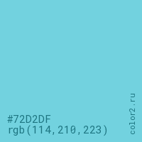 Цвет #72D2DF в цветовой модели RGB обозначается тремя октетами (114, 210, 223) в десятичном формате и #72D2DF в шестнадцатиричном (hex) формате, которые являются интенсивностью красного 114 (hex 72), интенсивность зелёного 210 (hex D2) и интенсивность синего 223 (hex DF).