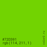 Цвет #72D301 в цветовой модели RGB обозначается тремя октетами (114, 211, 1) в десятичном формате и #72D301 в шестнадцатиричном (hex) формате, которые являются интенсивностью красного 114 (hex 72), интенсивность зелёного 211 (hex D3) и интенсивность синего 1 (hex 01).
