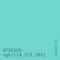 Цвет #72D5CD в цветовой модели RGB обозначается тремя октетами (114, 213, 205) в десятичном формате и #72D5CD в шестнадцатиричном (hex) формате, которые являются интенсивностью красного 114 (hex 72), интенсивность зелёного 213 (hex D5) и интенсивность синего 205 (hex CD).