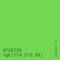 Цвет #72D753 в цветовой модели RGB обозначается тремя октетами (114, 215, 83) в десятичном формате и #72D753 в шестнадцатиричном (hex) формате, которые являются интенсивностью красного 114 (hex 72), интенсивность зелёного 215 (hex D7) и интенсивность синего 83 (hex 53).