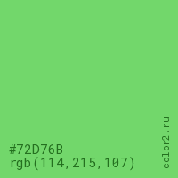 Цвет #72D76B в цветовой модели RGB обозначается тремя октетами (114, 215, 107) в десятичном формате и #72D76B в шестнадцатиричном (hex) формате, которые являются интенсивностью красного 114 (hex 72), интенсивность зелёного 215 (hex D7) и интенсивность синего 107 (hex 6B).