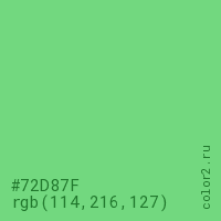 Цвет #72D87F в цветовой модели RGB обозначается тремя октетами (114, 216, 127) в десятичном формате и #72D87F в шестнадцатиричном (hex) формате, которые являются интенсивностью красного 114 (hex 72), интенсивность зелёного 216 (hex D8) и интенсивность синего 127 (hex 7F).
