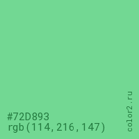 Цвет #72D893 в цветовой модели RGB обозначается тремя октетами (114, 216, 147) в десятичном формате и #72D893 в шестнадцатиричном (hex) формате, которые являются интенсивностью красного 114 (hex 72), интенсивность зелёного 216 (hex D8) и интенсивность синего 147 (hex 93).