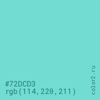 Цвет #72DCD3 в цветовой модели RGB обозначается тремя октетами (114, 220, 211) в десятичном формате и #72DCD3 в шестнадцатиричном (hex) формате, которые являются интенсивностью красного 114 (hex 72), интенсивность зелёного 220 (hex DC) и интенсивность синего 211 (hex D3).