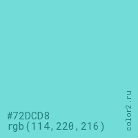 Цвет #72DCD8 в цветовой модели RGB обозначается тремя октетами (114, 220, 216) в десятичном формате и #72DCD8 в шестнадцатиричном (hex) формате, которые являются интенсивностью красного 114 (hex 72), интенсивность зелёного 220 (hex DC) и интенсивность синего 216 (hex D8).