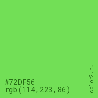 Цвет #72DF56 в цветовой модели RGB обозначается тремя октетами (114, 223, 86) в десятичном формате и #72DF56 в шестнадцатиричном (hex) формате, которые являются интенсивностью красного 114 (hex 72), интенсивность зелёного 223 (hex DF) и интенсивность синего 86 (hex 56).