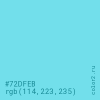 Цвет #72DFEB в цветовой модели RGB обозначается тремя октетами (114, 223, 235) в десятичном формате и #72DFEB в шестнадцатиричном (hex) формате, которые являются интенсивностью красного 114 (hex 72), интенсивность зелёного 223 (hex DF) и интенсивность синего 235 (hex EB).