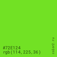 Цвет #72E124 в цветовой модели RGB обозначается тремя октетами (114, 225, 36) в десятичном формате и #72E124 в шестнадцатиричном (hex) формате, которые являются интенсивностью красного 114 (hex 72), интенсивность зелёного 225 (hex E1) и интенсивность синего 36 (hex 24).