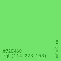 Цвет #72E46C в цветовой модели RGB обозначается тремя октетами (114, 228, 108) в десятичном формате и #72E46C в шестнадцатиричном (hex) формате, которые являются интенсивностью красного 114 (hex 72), интенсивность зелёного 228 (hex E4) и интенсивность синего 108 (hex 6C).