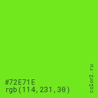 Цвет #72E71E в цветовой модели RGB обозначается тремя октетами (114, 231, 30) в десятичном формате и #72E71E в шестнадцатиричном (hex) формате, которые являются интенсивностью красного 114 (hex 72), интенсивность зелёного 231 (hex E7) и интенсивность синего 30 (hex 1E).