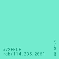 Цвет #72EBCE в цветовой модели RGB обозначается тремя октетами (114, 235, 206) в десятичном формате и #72EBCE в шестнадцатиричном (hex) формате, которые являются интенсивностью красного 114 (hex 72), интенсивность зелёного 235 (hex EB) и интенсивность синего 206 (hex CE).