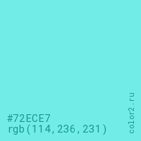 Цвет #72ECE7 в цветовой модели RGB обозначается тремя октетами (114, 236, 231) в десятичном формате и #72ECE7 в шестнадцатиричном (hex) формате, которые являются интенсивностью красного 114 (hex 72), интенсивность зелёного 236 (hex EC) и интенсивность синего 231 (hex E7).