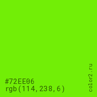 Цвет #72EE06 в цветовой модели RGB обозначается тремя октетами (114, 238, 6) в десятичном формате и #72EE06 в шестнадцатиричном (hex) формате, которые являются интенсивностью красного 114 (hex 72), интенсивность зелёного 238 (hex EE) и интенсивность синего 6 (hex 06).