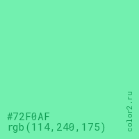 Цвет #72F0AF в цветовой модели RGB обозначается тремя октетами (114, 240, 175) в десятичном формате и #72F0AF в шестнадцатиричном (hex) формате, которые являются интенсивностью красного 114 (hex 72), интенсивность зелёного 240 (hex F0) и интенсивность синего 175 (hex AF).