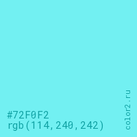 Цвет #72F0F2 в цветовой модели RGB обозначается тремя октетами (114, 240, 242) в десятичном формате и #72F0F2 в шестнадцатиричном (hex) формате, которые являются интенсивностью красного 114 (hex 72), интенсивность зелёного 240 (hex F0) и интенсивность синего 242 (hex F2).