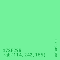 Цвет #72F29B в цветовой модели RGB обозначается тремя октетами (114, 242, 155) в десятичном формате и #72F29B в шестнадцатиричном (hex) формате, которые являются интенсивностью красного 114 (hex 72), интенсивность зелёного 242 (hex F2) и интенсивность синего 155 (hex 9B).