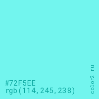 Цвет #72F5EE в цветовой модели RGB обозначается тремя октетами (114, 245, 238) в десятичном формате и #72F5EE в шестнадцатиричном (hex) формате, которые являются интенсивностью красного 114 (hex 72), интенсивность зелёного 245 (hex F5) и интенсивность синего 238 (hex EE).