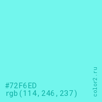 Цвет #72F6ED в цветовой модели RGB обозначается тремя октетами (114, 246, 237) в десятичном формате и #72F6ED в шестнадцатиричном (hex) формате, которые являются интенсивностью красного 114 (hex 72), интенсивность зелёного 246 (hex F6) и интенсивность синего 237 (hex ED).