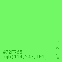 Цвет #72F765 в цветовой модели RGB обозначается тремя октетами (114, 247, 101) в десятичном формате и #72F765 в шестнадцатиричном (hex) формате, которые являются интенсивностью красного 114 (hex 72), интенсивность зелёного 247 (hex F7) и интенсивность синего 101 (hex 65).