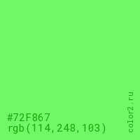 Цвет #72F867 в цветовой модели RGB обозначается тремя октетами (114, 248, 103) в десятичном формате и #72F867 в шестнадцатиричном (hex) формате, которые являются интенсивностью красного 114 (hex 72), интенсивность зелёного 248 (hex F8) и интенсивность синего 103 (hex 67).