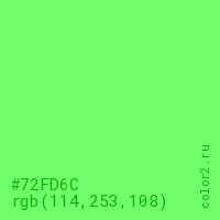 Цвет #72FD6C в цветовой модели RGB обозначается тремя октетами (114, 253, 108) в десятичном формате и #72FD6C в шестнадцатиричном (hex) формате, которые являются интенсивностью красного 114 (hex 72), интенсивность зелёного 253 (hex FD) и интенсивность синего 108 (hex 6C).
