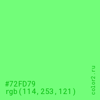 Цвет #72FD79 в цветовой модели RGB обозначается тремя октетами (114, 253, 121) в десятичном формате и #72FD79 в шестнадцатиричном (hex) формате, которые являются интенсивностью красного 114 (hex 72), интенсивность зелёного 253 (hex FD) и интенсивность синего 121 (hex 79).