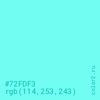 Цвет #72FDF3 в цветовой модели RGB обозначается тремя октетами (114, 253, 243) в десятичном формате и #72FDF3 в шестнадцатиричном (hex) формате, которые являются интенсивностью красного 114 (hex 72), интенсивность зелёного 253 (hex FD) и интенсивность синего 243 (hex F3).