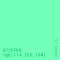 Цвет #72FFB8 в цветовой модели RGB обозначается тремя октетами (114, 255, 184) в десятичном формате и #72FFB8 в шестнадцатиричном (hex) формате, которые являются интенсивностью красного 114 (hex 72), интенсивность зелёного 255 (hex FF) и интенсивность синего 184 (hex B8).