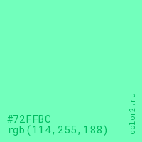 Цвет #72FFBC в цветовой модели RGB обозначается тремя октетами (114, 255, 188) в десятичном формате и #72FFBC в шестнадцатиричном (hex) формате, которые являются интенсивностью красного 114 (hex 72), интенсивность зелёного 255 (hex FF) и интенсивность синего 188 (hex BC).