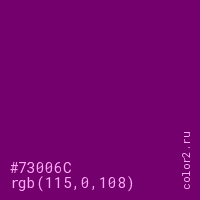 Цвет #73006C в цветовой модели RGB обозначается тремя октетами (115, 0, 108) в десятичном формате и #73006C в шестнадцатиричном (hex) формате, которые являются интенсивностью красного 115 (hex 73), интенсивность зелёного 0 (hex 00) и интенсивность синего 108 (hex 6C).