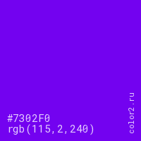 Цвет #7302F0 в цветовой модели RGB обозначается тремя октетами (115, 2, 240) в десятичном формате и #7302F0 в шестнадцатиричном (hex) формате, которые являются интенсивностью красного 115 (hex 73), интенсивность зелёного 2 (hex 02) и интенсивность синего 240 (hex F0).