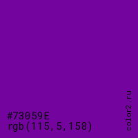 Цвет #73059E в цветовой модели RGB обозначается тремя октетами (115, 5, 158) в десятичном формате и #73059E в шестнадцатиричном (hex) формате, которые являются интенсивностью красного 115 (hex 73), интенсивность зелёного 5 (hex 05) и интенсивность синего 158 (hex 9E).