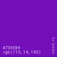Цвет #730EB9 в цветовой модели RGB обозначается тремя октетами (115, 14, 185) в десятичном формате и #730EB9 в шестнадцатиричном (hex) формате, которые являются интенсивностью красного 115 (hex 73), интенсивность зелёного 14 (hex 0E) и интенсивность синего 185 (hex B9).