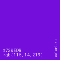 Цвет #730EDB в цветовой модели RGB обозначается тремя октетами (115, 14, 219) в десятичном формате и #730EDB в шестнадцатиричном (hex) формате, которые являются интенсивностью красного 115 (hex 73), интенсивность зелёного 14 (hex 0E) и интенсивность синего 219 (hex DB).