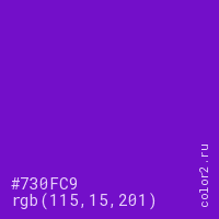 Цвет #730FC9 в цветовой модели RGB обозначается тремя октетами (115, 15, 201) в десятичном формате и #730FC9 в шестнадцатиричном (hex) формате, которые являются интенсивностью красного 115 (hex 73), интенсивность зелёного 15 (hex 0F) и интенсивность синего 201 (hex C9).