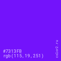 Цвет #7313FB в цветовой модели RGB обозначается тремя октетами (115, 19, 251) в десятичном формате и #7313FB в шестнадцатиричном (hex) формате, которые являются интенсивностью красного 115 (hex 73), интенсивность зелёного 19 (hex 13) и интенсивность синего 251 (hex FB).